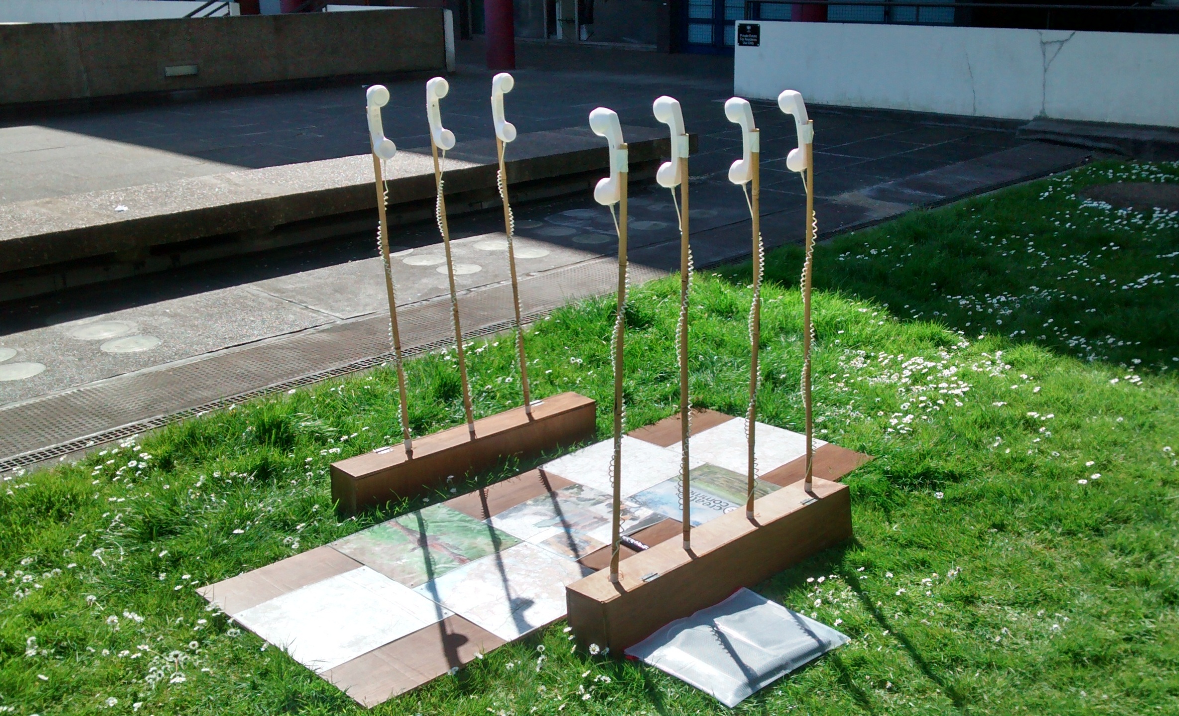 The Paths We Tread is an outdoor interactive sound installation constructed with telephones and a giant hopscotch board which presents stories of the earth trodden over by potentially thousands of people throughout history. The sounds projected from the telephone receivers are recordings of poems written by the local community based on their experiences and thoughts of the countryside and nature. These poems are bespoke to each location that the installation visits. Each tile triggers a different poem so when the path is walked across, a dialogue is formed between the earth, the person interacting with the installation and others who have walked across the land. The Paths We Tread explores the tension between private property and public land, using oral histories.