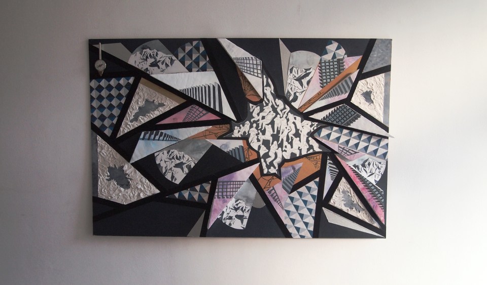 Medium: Acrylic paint, polyfiller, tape, polystyrene, pencil and a compass on hardboard. 60cm x 90cm