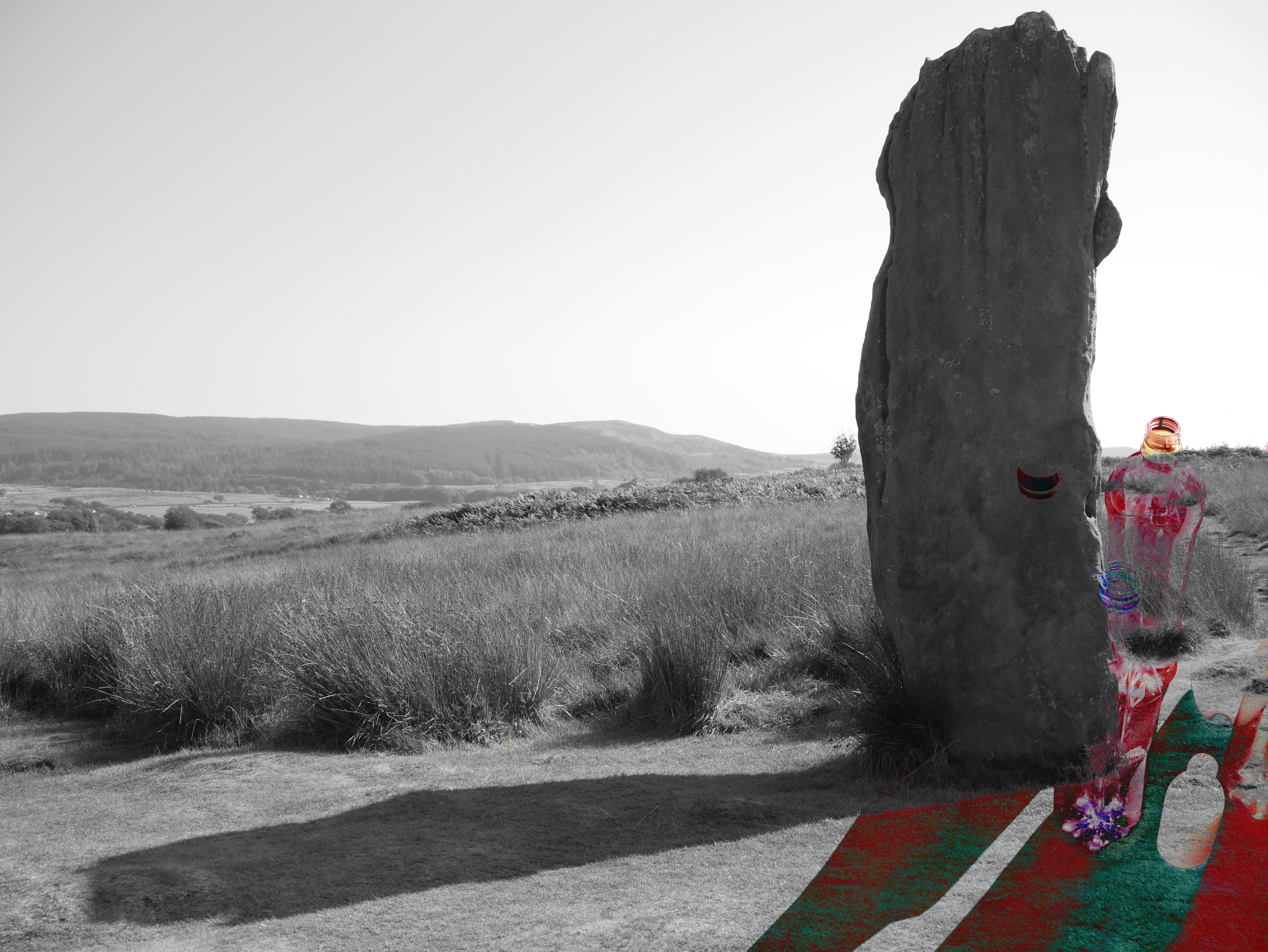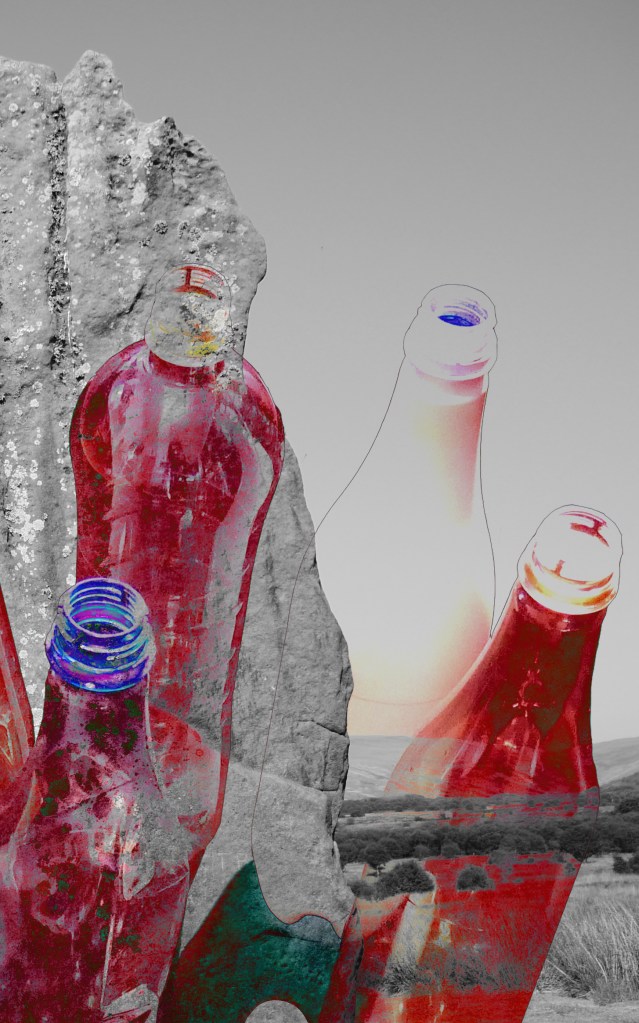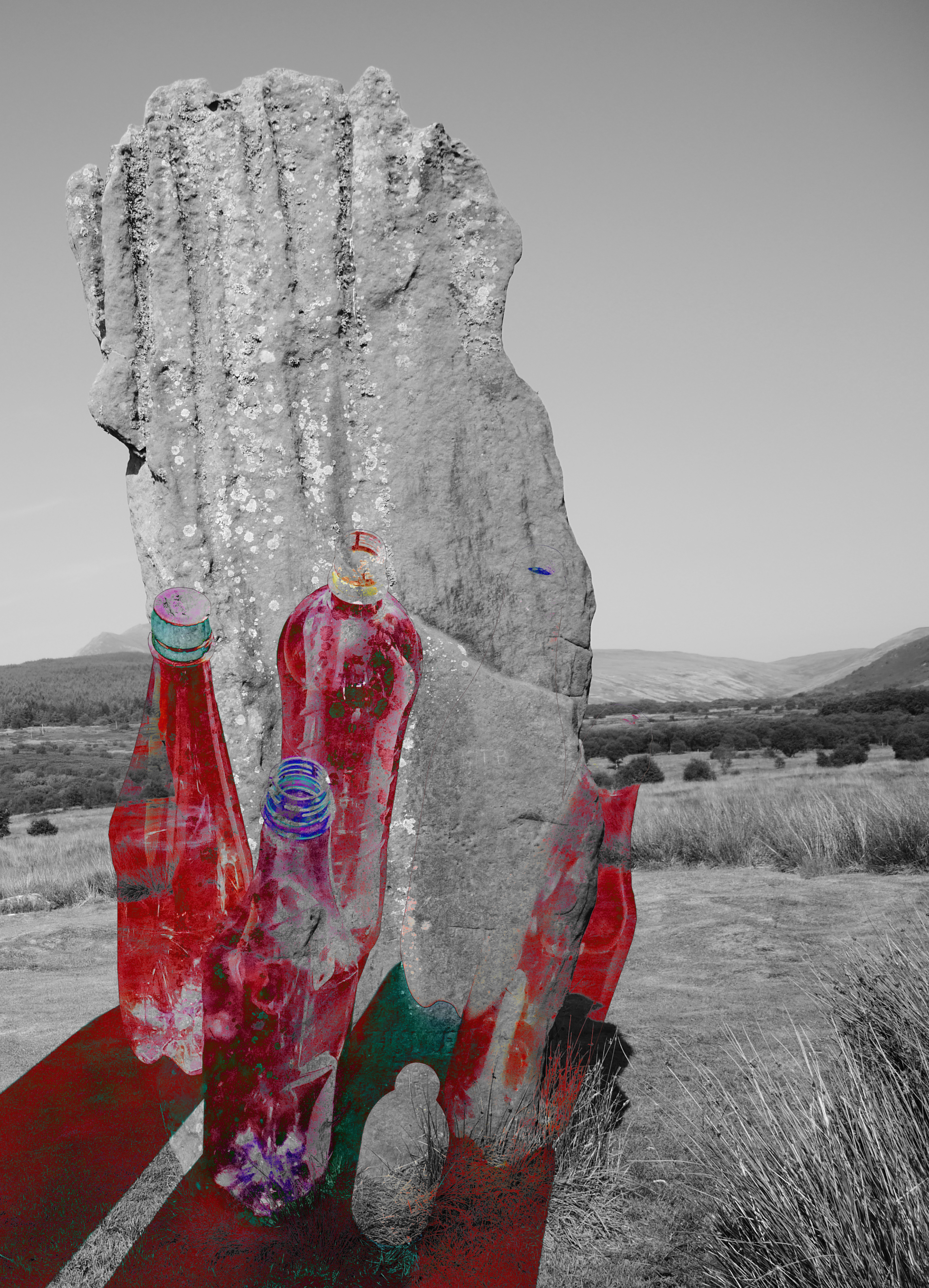 Photographs and digital collage, various dimensions. Keywords: environmental art, climate change, plastic, legacy, blood, stone, Scotland landscape.