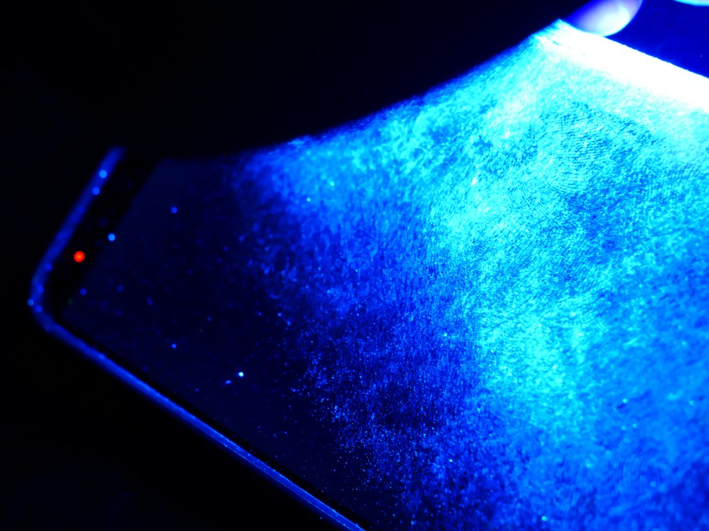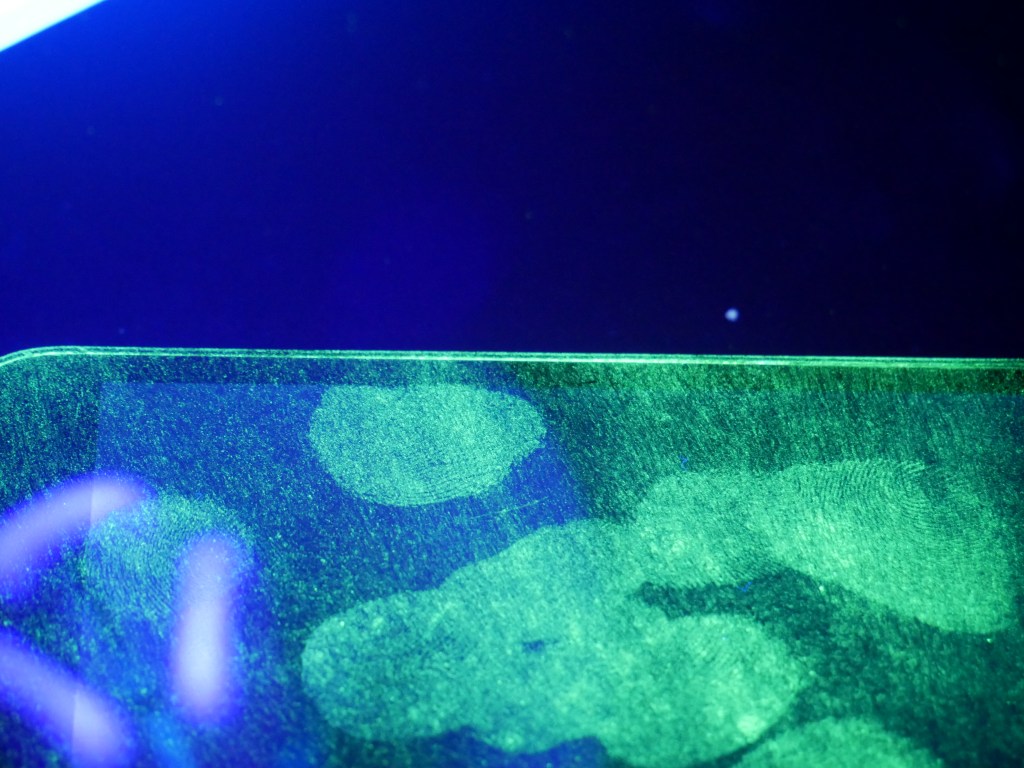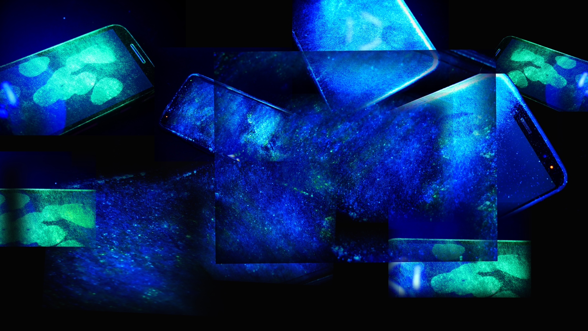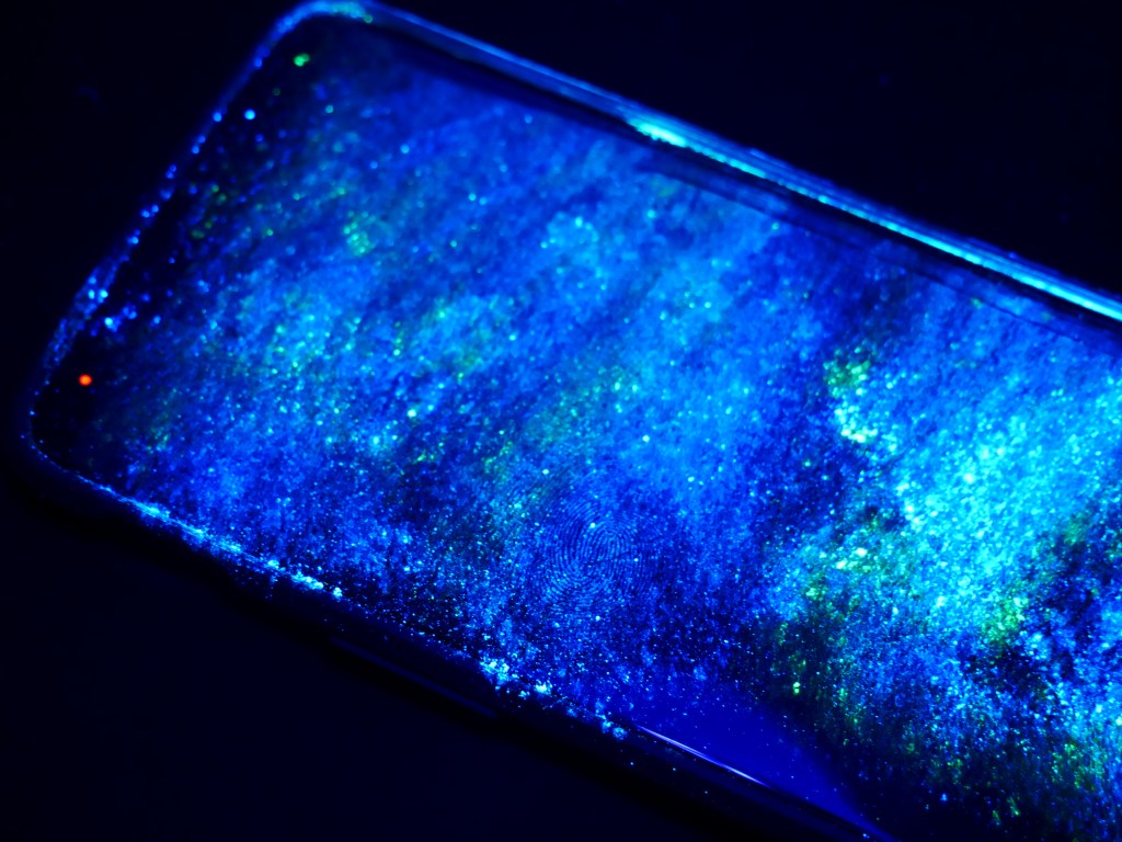 On the screen or projection is an image that is reminiscent of a starry nightsky but is made of illuminated fingerprints on mobile phones and digital screens. Hinting towards the blanket criminalisation of observable actions implied in contemporary surveillance practices, these fingerprints are made visible through the use of ultraviolet light. A connection between physical and virtual space, these traces allude to the trails we leave behind (often unseen to us) when we are navigating online territory.