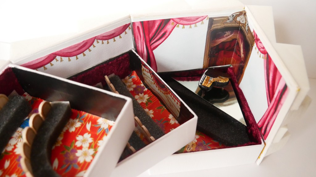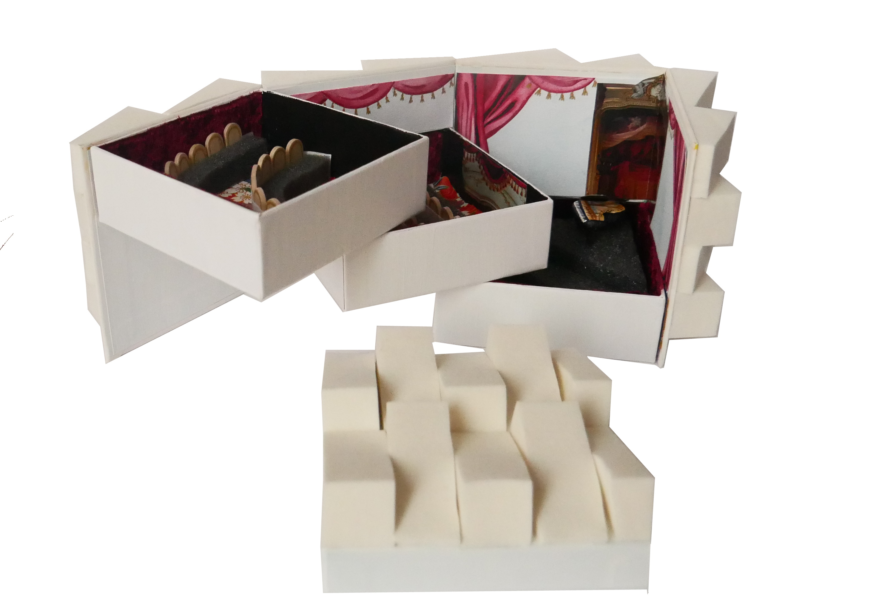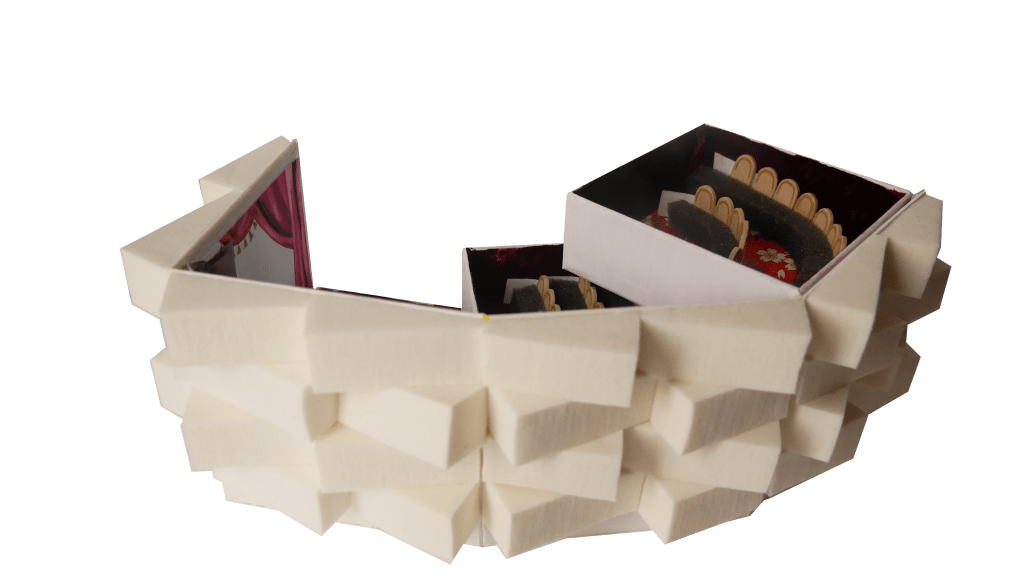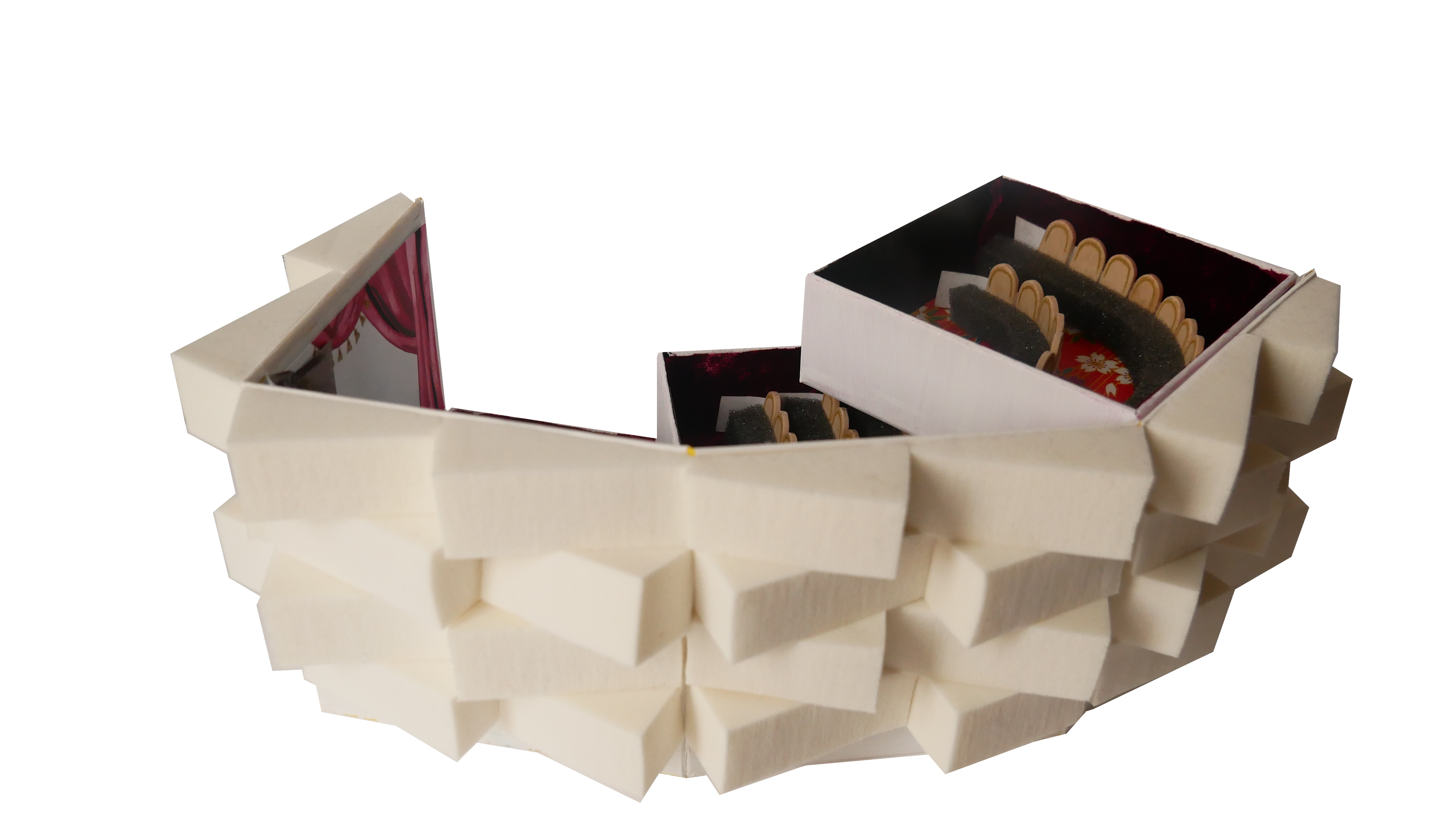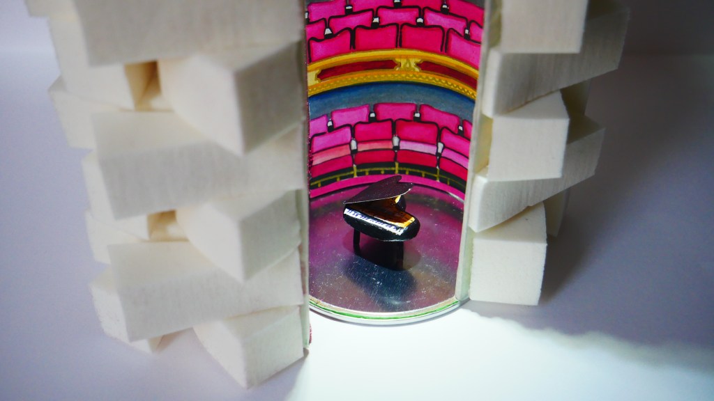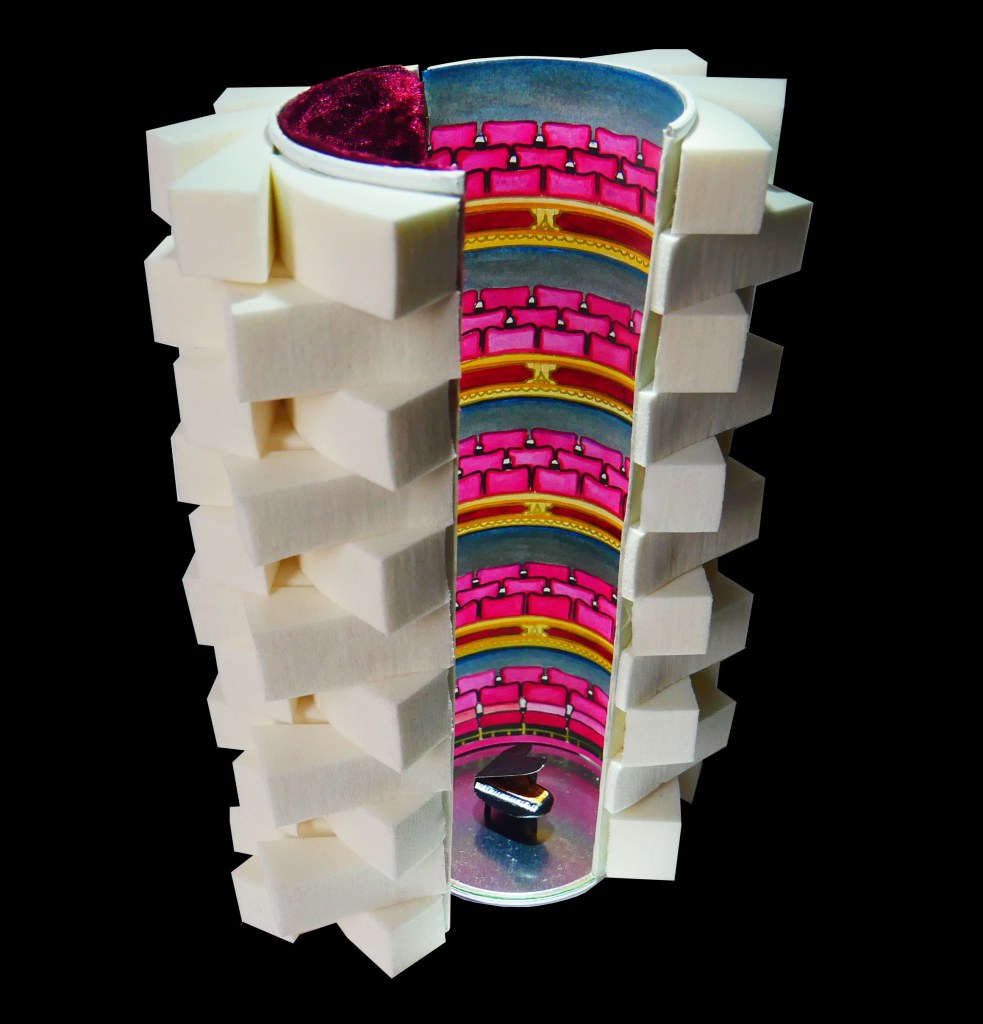 Repurposing confectionary packaging to create a series of miniature concert halls, the first two sculptures in this series house a means of creative expression (in this case, a grand piano a little more than 1cm in diameter). On the outside is a layer of insulation that resembles acoustic sound-proofing foam. In one work, the audience seats are made from lolly-sticks and the layers of a chocolate box provide the basic architectural structure of a tiered theatre space.