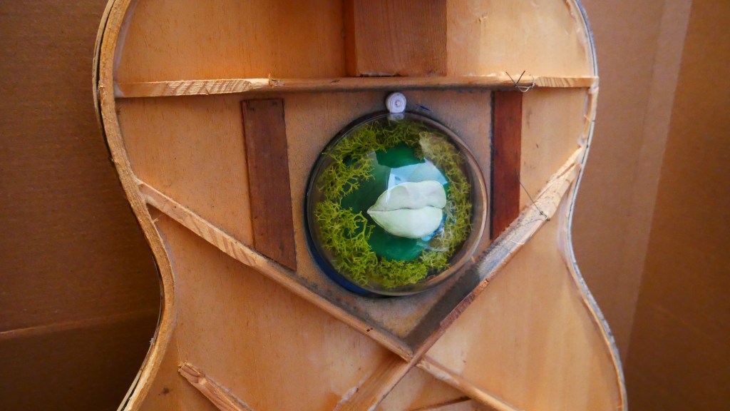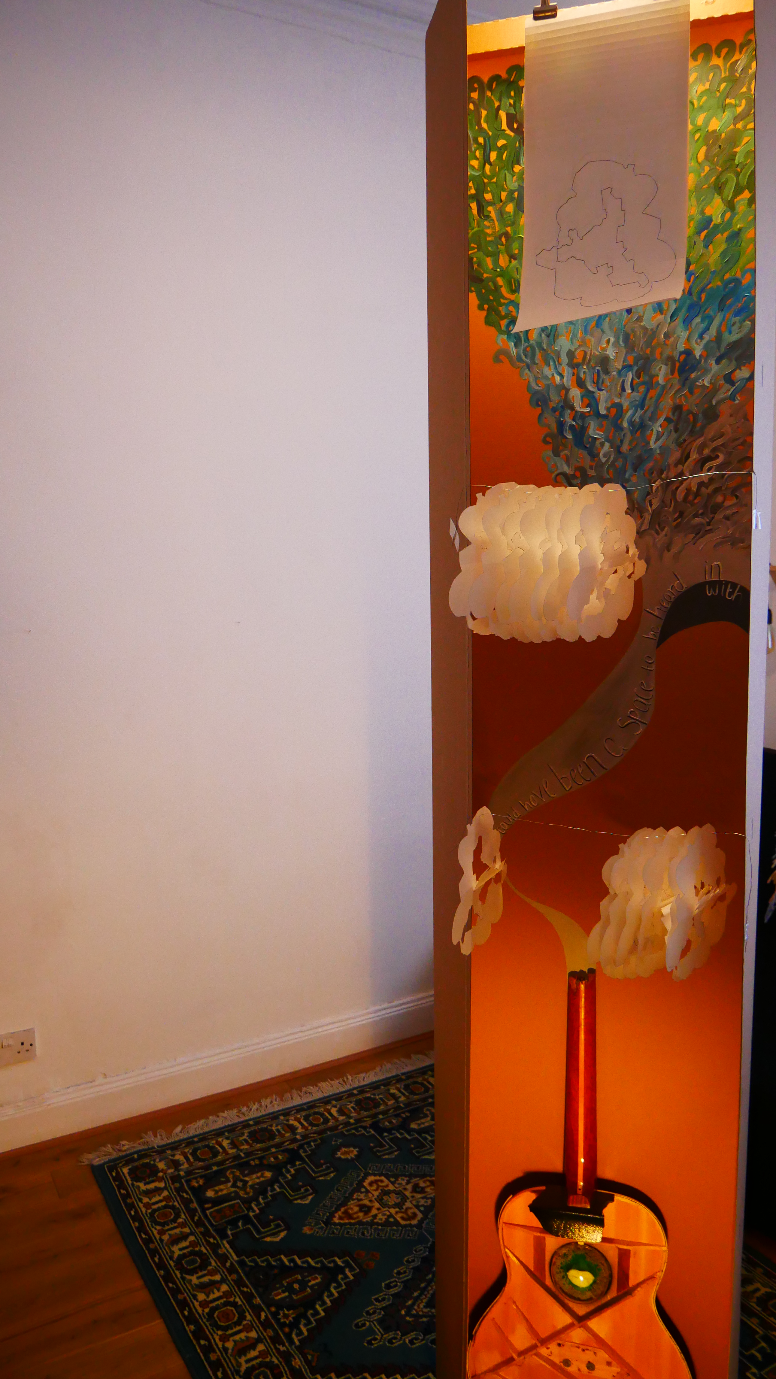 Continuing to explore the synergies between architecture, music and hierarchies of who is listened to, I created a larger work to stand alongside the miniatures in the summer exhibitions. This time I brought together a smashed-up guitar that I found on the street and multiple tracings of Antonia’s architectural sketches; both emblematic of the latent potential of discarded materials and the ideas and expressions that are side-lined as a result.