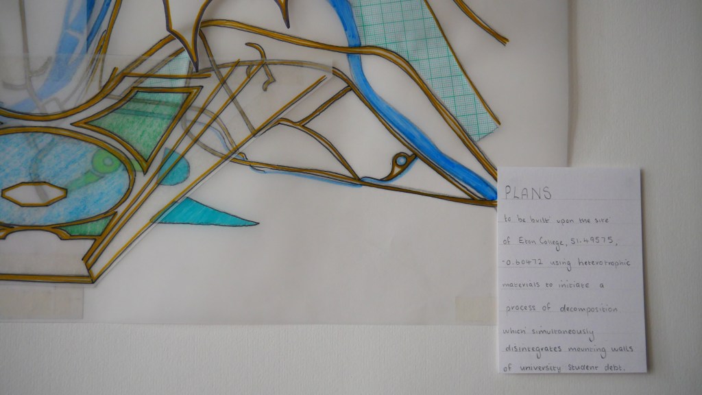 Not bound by the limits of brick, mortar and traditional building materials, this structure is to be constructed with heterotrophic matter (i.e. fungi) initiating a process of decomposition, absorbing and breaking down an institution of social inequality and disproportionate wealth. In hindsight, perhaps this is a literal internalisation of the ‘eat the rich’ slogan.