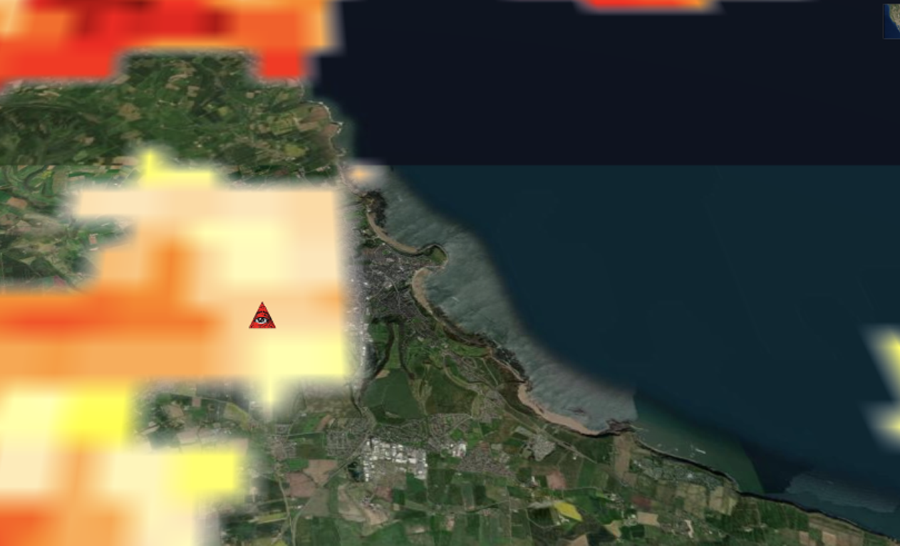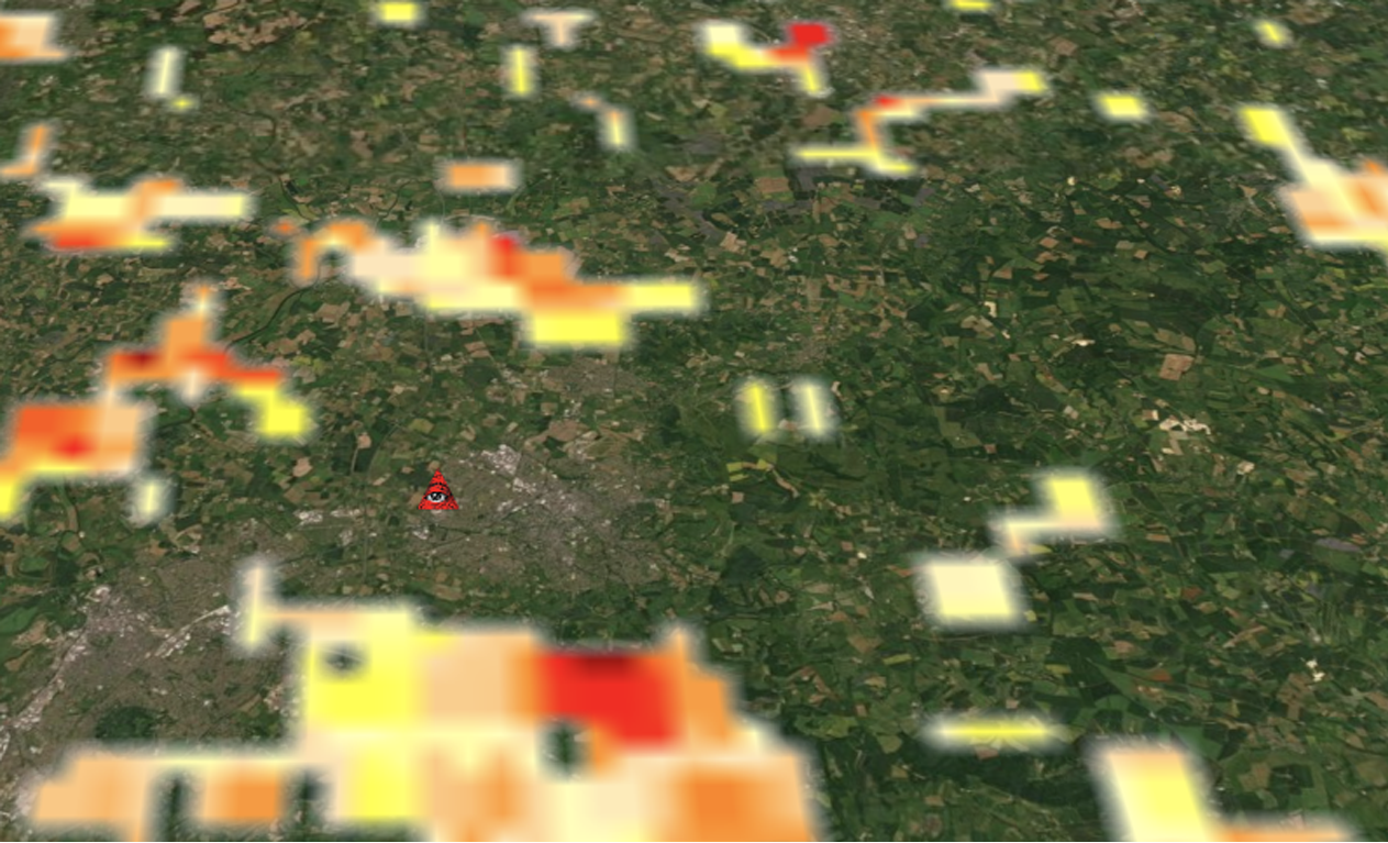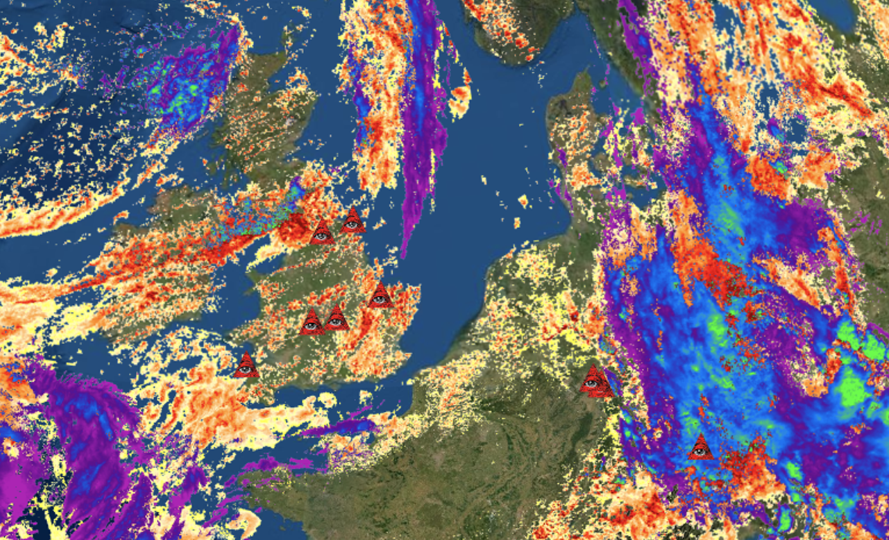 A series of images made by combining maps that show surveillance network Five Eyes locations in the UK and cloud optical thickness.