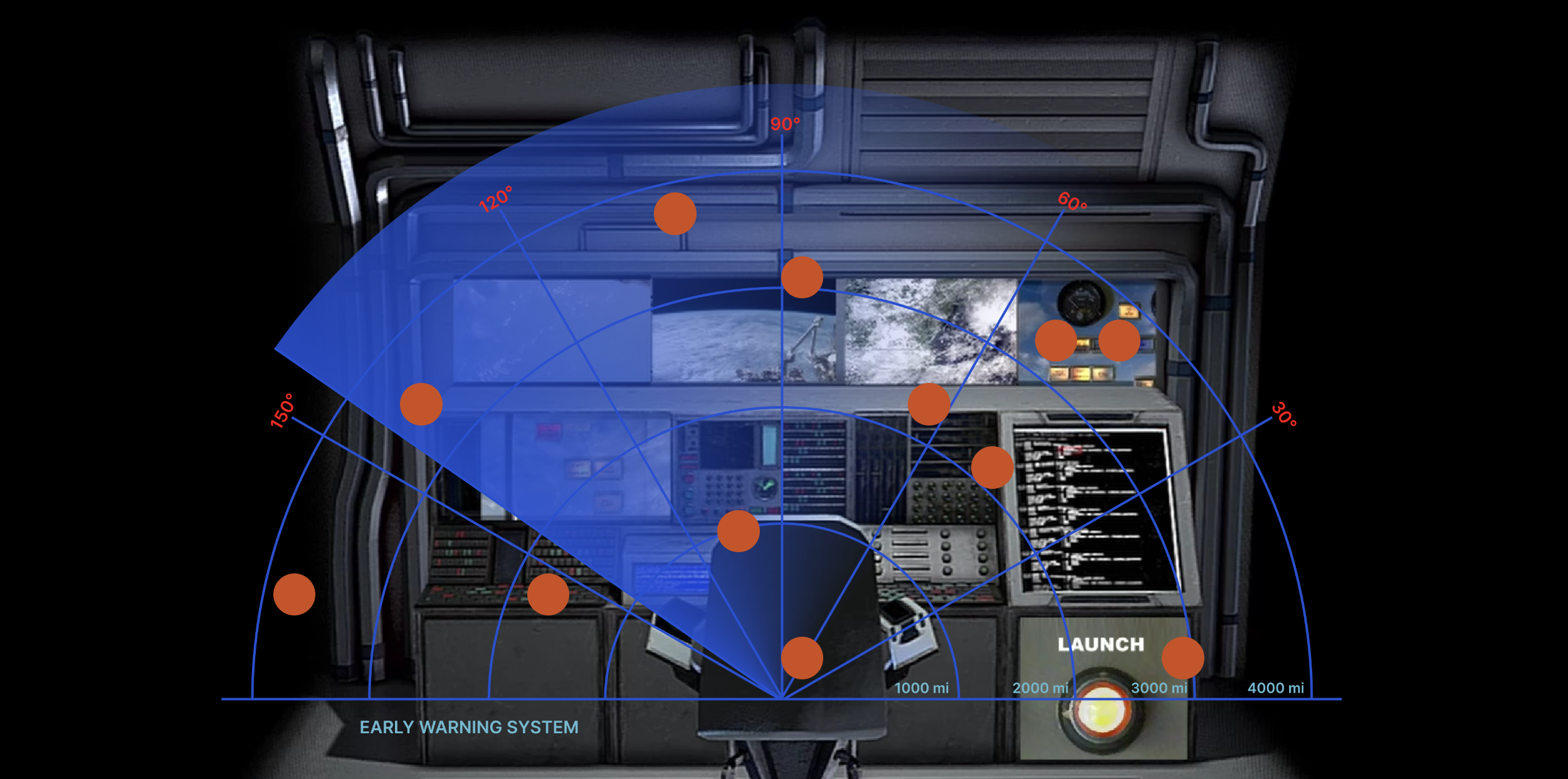 Enter the crushing architecture of an underground bunker, sealed off from events happening above ground, its only connection with the outside world being via flows of data, radar and computer signal processing. A launch button flashes. A dashboard of control panels, blinking lights, satellite imagery lies in reaching distance. The passing of time feels claustrophobic with anticipation and the pressure to act.